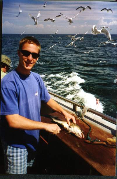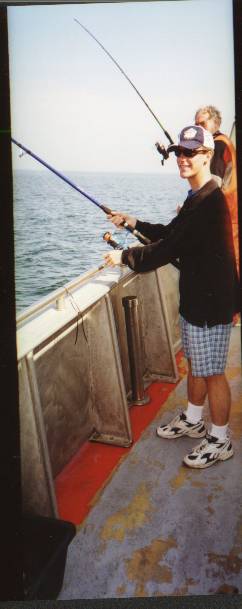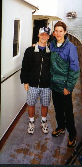 Clem und ich an Bord beim Hochseeangeln, Winderstaerke 9, 12m hohe Wellen, doch echte Seemaenner kann nichts erschuettern...........